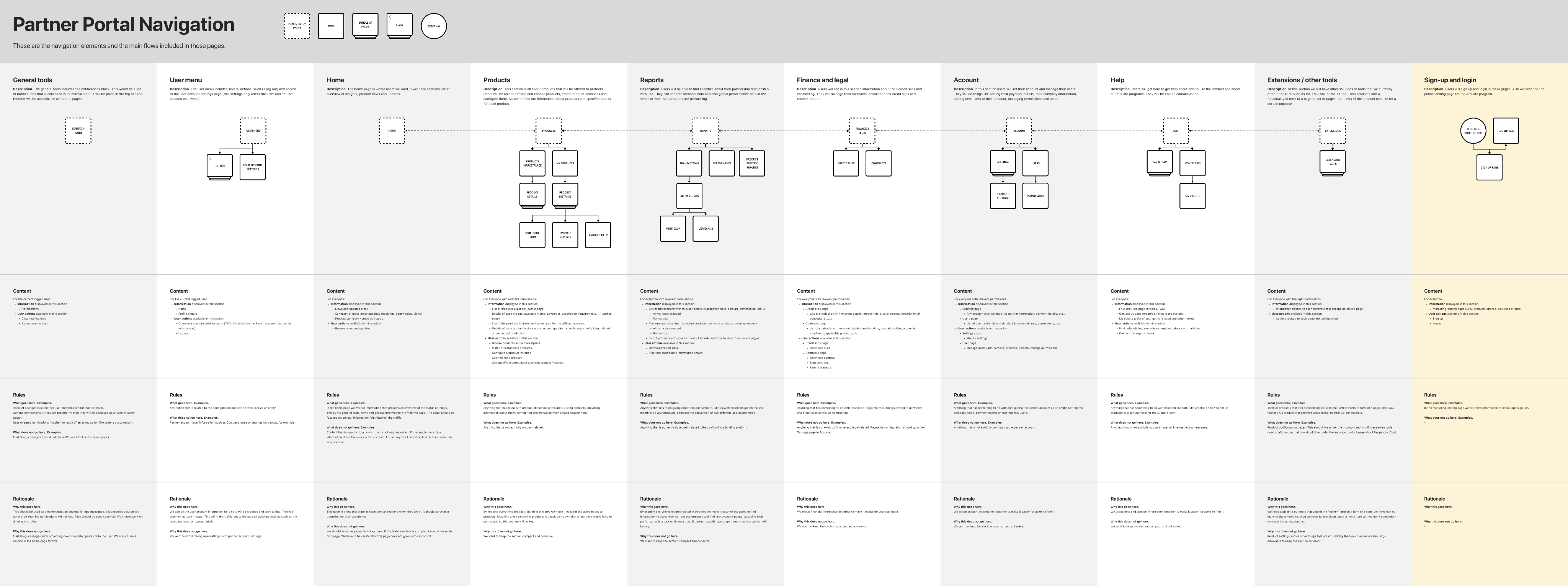 Navigation mapping created by Huan Colino, outlining the desired structure of the partner portal and identifying the key pages required for the self serve experience. We used this map as an ancore to